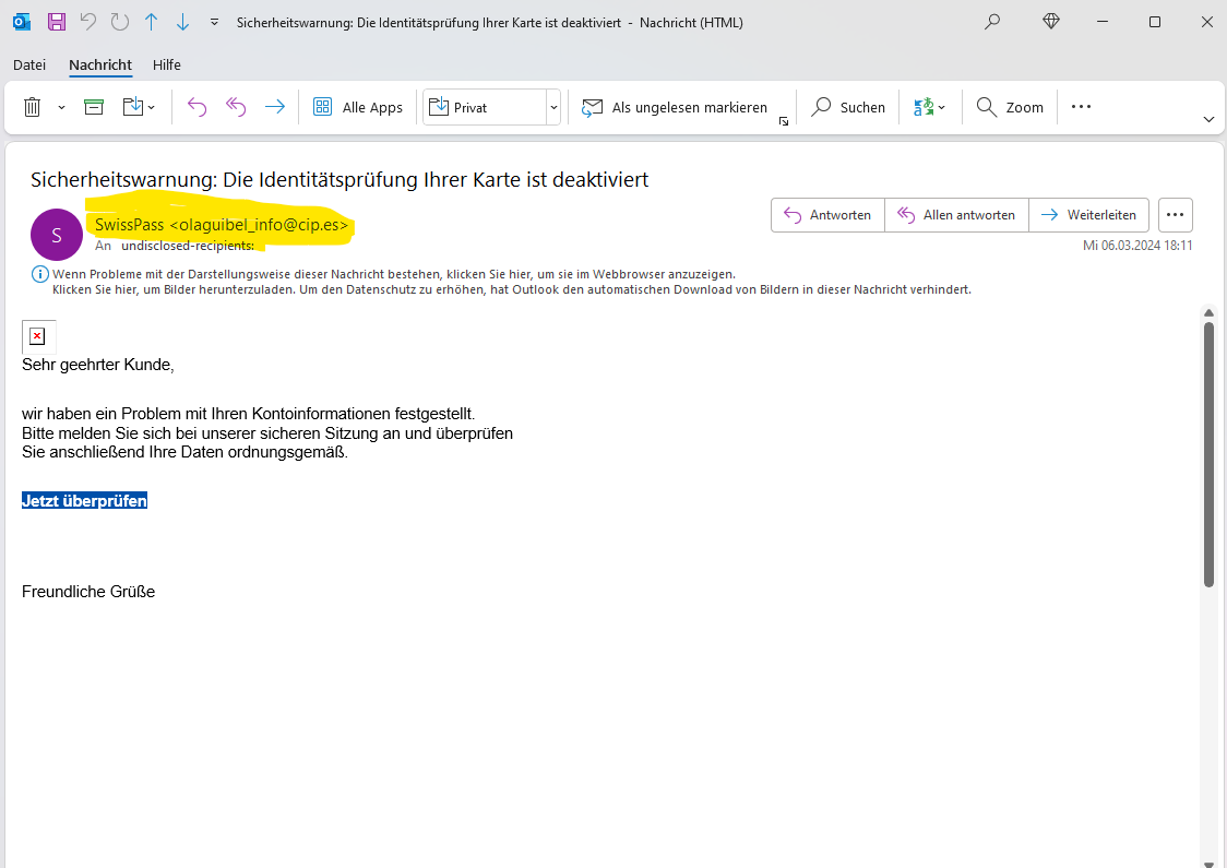 Aktuell sind die meisten Kleinfirmen und Privatanwender mit Emails bedroht, die einen Cyberangriff bezwecken. Zum Beispiel erhalten Sie von irgendwelchen Paketzustellern ein Email, dass ein Paket für Sie bereit ist oder Sie noch etwas bezahlen müssten, damit das Paket ausgeliefert wird. Es können auch Banken, Versicherungen, Internet-Shops, Streaming-Dienste oder andere Firmen oder Verwaltungen sein, die Angeben, dass Ihr Abo oder Passwort abgelaufen sei und Sie sich mit dem folgenden Link anmelden sollen. Tun Sie das bitte nie! Sie können ein paar Dinge prüfen und eine Wirkungsvolle Massnahme treffen: