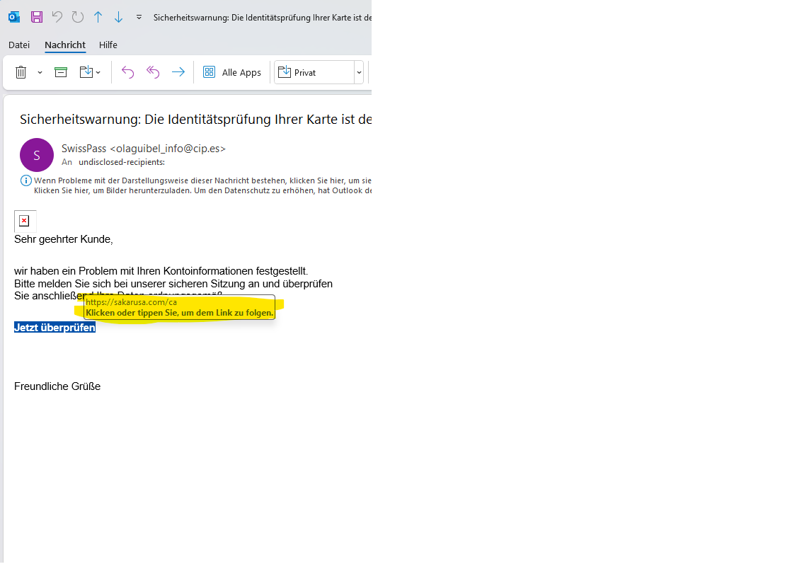 - Zweitens: Schauen Sie genau ob das Email den richtigen Absender hat zum Beispiel «info@post.com» anstelle «info@pots.com» oder «post@cyber.ch» 📷.